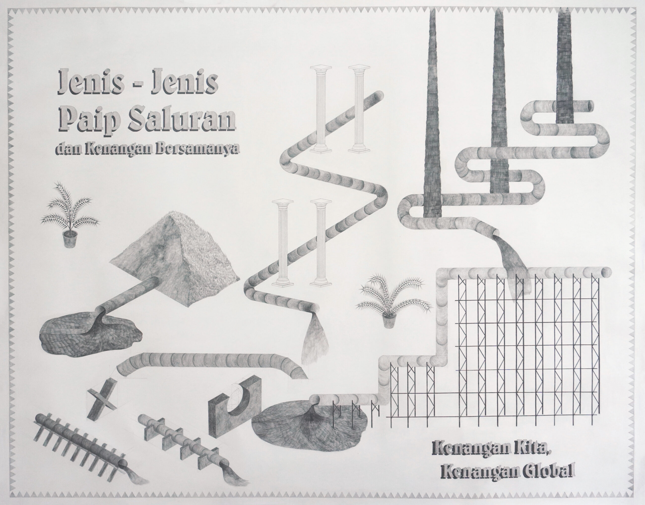 His four-year worldbuilding project, Taman Kenangan (Nostalgia park), charts an imaginary terraforming effort on Gunung Ledang, a mountain in Malaysia. In Malay folklore, the mountain is home to a celestial princess, embodying a connection to the divine, a trait shared by many mountains across cultures—think Mount Olympus, Mount Sinai, Mount Meru, or Mount Kailash. But in Arif’s alternate timeline, the mountain is whittled down and transformed into luxury condominiums. The erasure holds a profound symbolic violence: the flattening of godlands to make way for a new neoliberal mythology.
