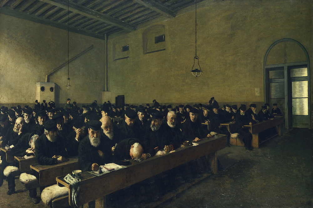 Cool subtlety characterizes the first floor, where Cohen’s song plays out. A film by Kluge fills a screen that extends from checkered marble floor to exposed wooden rafters, and in it German actor Peter Berling (a bearded 83-year-old who’s worked with Werner Herzog) blows out tall, white candles one by one. A glowing blue-and-white neon sign that reads “Hotel” hangs above a gold-framed doorway into a lobby you can’t enter. Across the room, there’s a similarly un-enterable door into a bar with the word “Safari” above it, lit up in pink neon. These sealed chambers are deceptive teasers; throughout the rest of the show, nearly all doors, even those padded or camouflaged by Viebrock, open to you. Go through one on the second floor, and you’ll find a stage with a small TV monitor on it, facing away, so you have to venture onstage to watch. Continue through the back curtains, then down three steps, and you’ll be standing beside an unnervingly smooth photograph Demand made in 2015: his subject a convincing paper replica he built of the Boston Marathon bombers’ backyard. Enter another door, encounter a room full of paintings by the 19th-century Italian artist Angelo Morbelli, and perhaps wonder if you’ve ventured into an altogether different exhibition. Morbelli has his own room because his work informed the exhibition, mostly thanks to the misreading of one painting in particular.