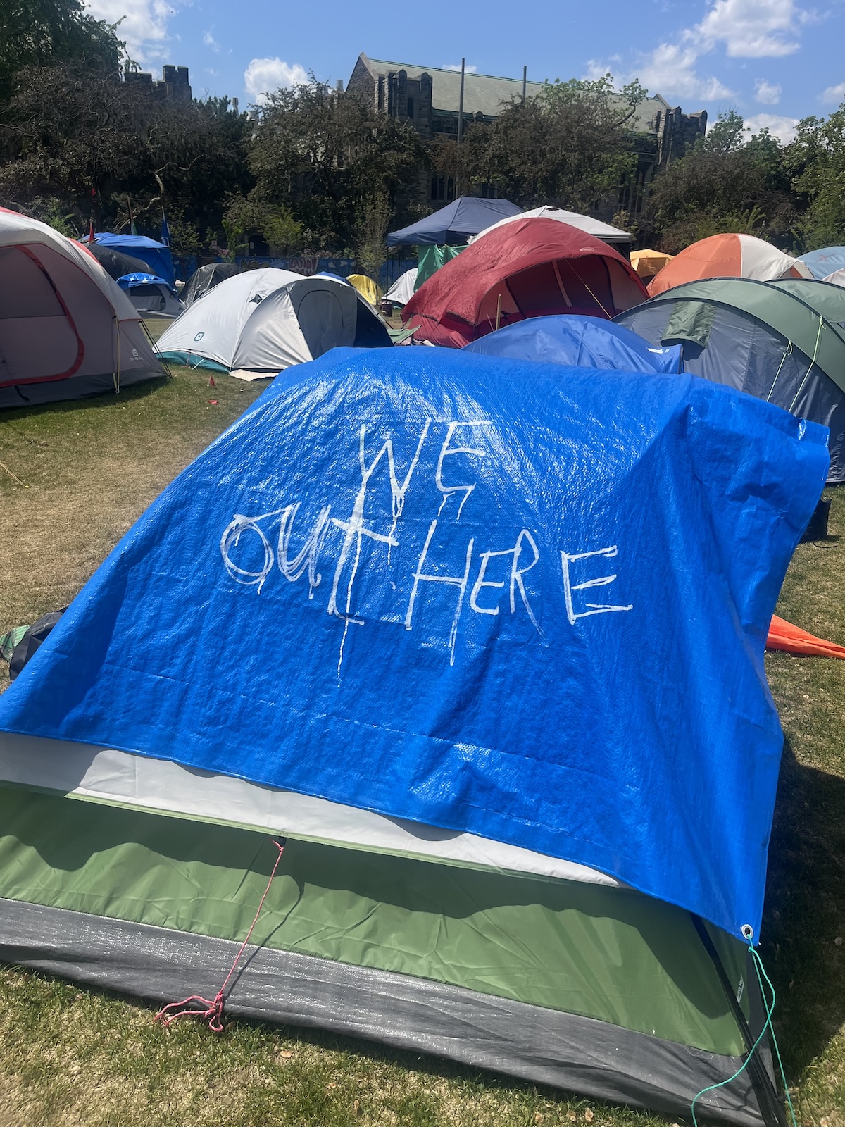 The most beautiful thing I saw in person this year were the encampments at the University of Toronto. The sky was so blue, like a matrix out of which University College, completed in 1859, had been etched. But the Romanesque revival of the university’s first permanent building, with its sturdy, thick brick walls and ornate arches, had nothing on the slight breeze making the flimsy graffitied tents shimmer. I saw “WE OUT HERE” painted onto a tent. If it had been in a museum, these words could have been both a title and the wall text announcing a diversity of practices: a creative-writing circle, a conversation about antiblack racism, restorative bodywork, movement, counseling. But this was more than a museum could ever be; this was life and death. At that particular hour, on an afternoon in May, it was quiet. I saw more tents than people, giving the atmosphere a sense of preparedness. More was coming. The people were getting ready. Looking south, Palestinian flags installed on the fences interrupted the Toronto skyline. I tried not to be romantic about all of the terrible beauty—but either way, it was fleeting. The art was there, and now it’s gone.