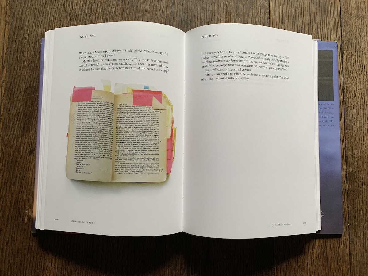 Free from an autobiographical or narrative format that would encourage an epic spun out from a punctum, Christina Sharpe’s newest book, Ordinary Notes, casts another distinct shape. Sharpe’s 248 notes pile up to form a pointed, sculptural thesis on the destabilized life of the Black diaspora. By this I mean that the notes themselves have an uneven nature to them that texture and construct the book. They shift in tone, form, and mood, between common definitions and intimate recollections, strategic redactions and vigorous, critical contextualizations of personal, contemporary, and historical events related to Black life and death. There is both duty and beauty to how Sharpe remembers and encounters those two poles. Successive losses in her family leave her bereft; so, too, do the murders of Black people that have made for morbid public spectacles for centuries. She is haunted by the videos of these recent murders that she cannot escape despite her best efforts. When she chooses to visit memorials dedicated to lynching victims and a plantation turned into a museum, she finds them disorienting in their dishonest contrivance. They recall for her exquisite sentences from books and poems she’s encountered throughout her life that ground her experiences of dissonance. Just as vividly, she’s able to conjure the scent and the sound of stirring cambric tea her mother would make for a tradition of Sunday salons where her family would read and sing together. Her interpolated notes, unbound by the logics of narrative and linear time, create intricate shapes that perhaps more honestly reflect the synaptic architecture of the act of remembrance: how one memory calls another, in a seemingly far-flung corner, to respond.