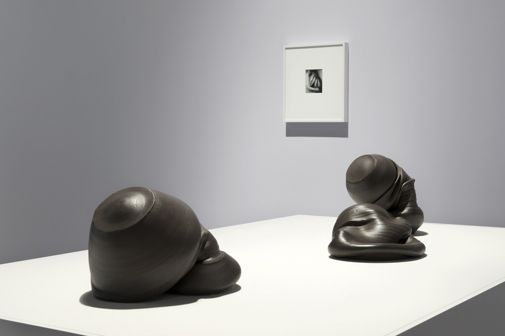 The bodies beneath the teeming earth – and seemingly wet clay – of Unruly Matter are themselves both precise and inchoate. Louise Bourgeois’s sculptures of Janus (the god of beginnings, time, and passageways, and symbolized by two faces) shudder to mind in Curreri’s collapsed, round-headed sculptures, and dual-mouthed photographs. Bourgeois greeted her ambivalent subject with a similar bemusement, the two heads of her Janus unmistakably penile, and connected by something vulval in its fray. Robert Mapplethorpe, too, lies supine beneath this body of work, though perhaps more for his formalist precision than the mere fact of photographing gay men’s desire.