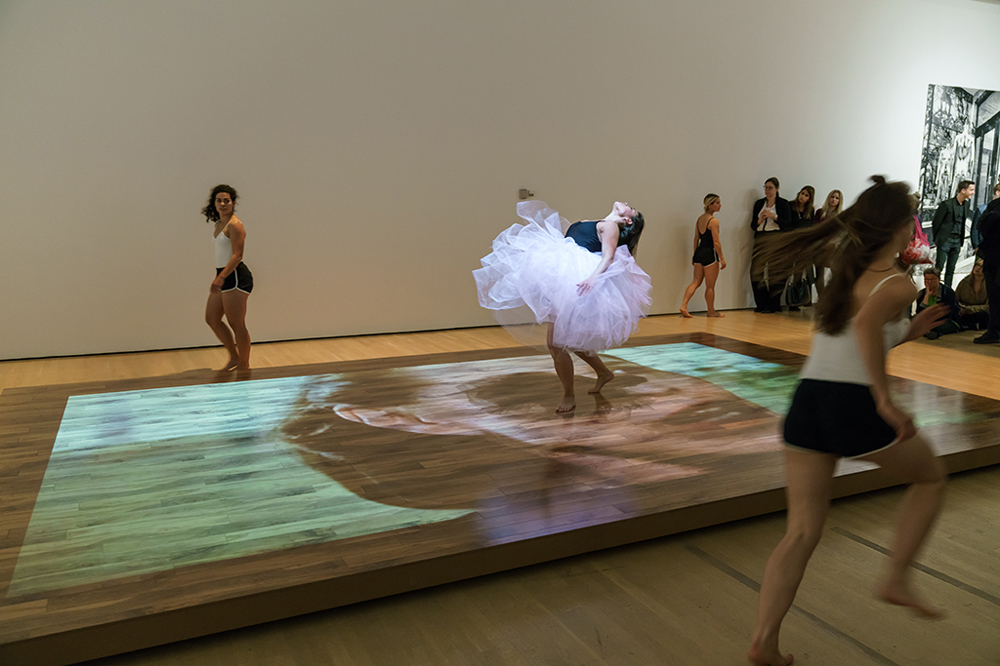 As Thompson’s work ably demonstrates, these plunges into the persistence of the past in the contemporary moment punch hardest when they touch on histories of exclusion, oppression, and colonization. Tanya Lukin Linklater’s video installation/dance performance He was a poet and he taught us how to react and to become this poetry (2016), handles such freighted subject matter with a lyrical touch. To realize the piece, the artist worked with a group of dancers on a composition based on the life of Maria Tallchief, a protégé of George Balanchine who was America’s first prima ballerina and the first Native American to hold the rank. The dance component is performed on a low stage, which also acts as a screen for the projection of a video about the ethics of cultural translation. The fact that the dancer’s bodies (and the oblique angle) both obstruct the viewer’s line of sight further elaborates the theme.