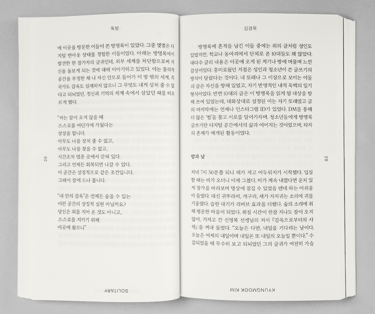 The firsthand accounts of contributors did satisfy the initial promise of Solitary—the demystification of the conditions inside the wellness center—at least on a material level. Each text filled in different details. “Like most prison facilities, Happitory is located on the outskirts of [Seoul], far from society,” writes Kyungmook Kim. “Upon entering, I changed into a uniform and received a name tag with my room number written on it.” Then, according to Jiwon Yu, the staff distribute instructional booklets, and participants watch an orientation video. Laptops, cell phones, and other personal items are confiscated before participants are directed to their rooms. The rooms are, to use Woochang Lee’s measurements, 3 by 1.8 by 2.5 meters. They have heated floors, a toilet, a washbasin, bedding, a yoga mat, a kettle and tea set, a desk, writing materials, and a panic button, which would, when pressed, allow the “inmate” to exit the cell and terminate the experience. What surprised me were the repeated mentions of windows in the cells—“The scenery outside the window was breathtakingly beautiful,” writes Sunjin Kim—since it is rare for a prison cell to provide an expansive view of the outside world. Solitary confinement is often linked in the popular imagination, and by researchers, to total sensory deprivation or at least to a clear-cut separation from the sights and sounds of nature, whereas Prison Inside Me seems to encourage communion with the forest around the facility. Equipped with amenities and vistas, the cells appear no different from college dorm rooms.