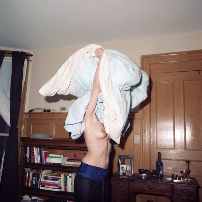 Karen Asher has always photographed people, from those she knows intimately to the strangers she meets in passing. As portraits, they fall within an established tradition of seemingly raw character studies purporting to capture that moment of bewitchment between camera and sitter. However The Full Catastrophe, Asher’s Spring exhibition at Winnipeg’s Ace Art Inc., seems to mark an impending change in her practice. As she returns to photography after a three-year hiatus due to a still-undiagnosed illness, she begins to estrange her subjects from the camera, even while they continue to actively perform for the lens. This, in turn, results in a shift in the camera’s position – from invited visitor to unwanted guest. Still present is Winnipeg’s art community, the bulk of which constitutes Asher’s circle of friends, but increasingly their faces are obscured and bodies ambiguously twisted. The two years of pictures on show feels more like a transition than a conclusion, building anticipation for future work.