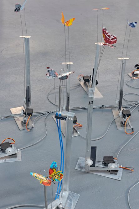 The tension between the artworks and their container creates a thematic contradiction that remains unresolved by the exhibition design. Confronted with systemic conditions that will probably see this venue replaced with another gentrified residential project, the curators nevertheless enact minor symbolic dissensions. For instance, colonial flows of resource extraction and transnational capital are highlighted in an elegantly-staged dialogue between Fernando Palma Rodriguez’s Tochiuapapalutzin (2012) and Napachie Pootoogook’s drawings (1988-99). Palma Rodriguez’s installation, named after the Nahuatl word for “our revered lady butterfly,” comprises 104 robotic monarch butterflies made out of beer and soft-drink cans. These are emblazoned with Pepsi, Coca Cola, Modelo, Corona, and other logos. The butterflies’ wings flutter, responding to passing footsteps and traffic by aid of seismic sensors. The accompanying text notes the ecological migration of monarch butterflies from Mexico to Canada, which Palma Rodriguez references. However, there is also a parallel flow of commodities and capital represented here. The multinational companies that produce these beverages are rapidly depleting groundwater reserves in multiple regions of Mexico where water is already scarce. Of course, a didactic text cannot be exhaustive, but this bit of context could have amplified a narrative thread that appears to be suggested by the spatial arrangement.