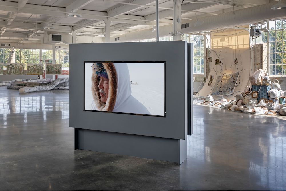 Installation view featuring works by Isuma Collective, Jumblies Theatre & Arts with Ange Loft, and Adrian Blackwell. Image courtesy of Photo: Toni Hafkenscheid. Courtesy the Toronto Biennial of Art.