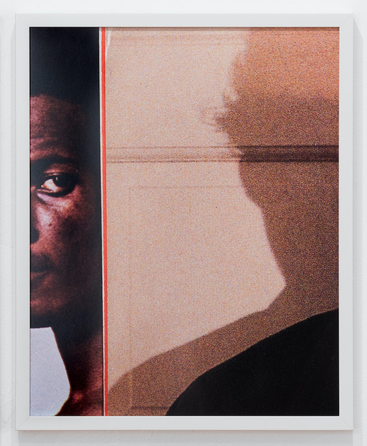 The removal of bodies comes off as a coy but effective tactic that renders the works into multivalent narratives. Silano’s fragmentation, achieved by including multiple images in each piece, stutter-steps and complicates the cliched passion of the original images, cools it down and makes it distant. The diptych Delicate (all works 2020) tempts the viewer by proposing a split encounter in which a man, seen from the collarbone up, partly hidden by a door, meets two shadows cast by other men’s heads. Warm afternoon light suffuses the scene, made domestic by the inclusion of a mirror and a dracaena plant. The work bears the hallmarks of appropriation’s postmodern foundations: the real and the shadow, reflection and doubling, the man and his echoes. Nakedness is implied, the erotic is evoked. But without the overt play of bodies, the scene is held in suspension, made still. What starts as a glimpse of future delights turns to something more doleful: the light is fading; the man could as easily be leaving the room as coming into it. Yes to Heaven‘s four panels (two in frames interspersed with two on wall vinyl) give prominence to pink satin and red roses; a man’s face and naked upper chest are merely cropped into a corner, but his thick-lashed, libidinous gaze draws notice. Tension builds between the amorousness of the subject’s expression and the way that repetition of the boudoir motif abstracts, rather than underscores, the space of his intensity, and holds it out of reach.