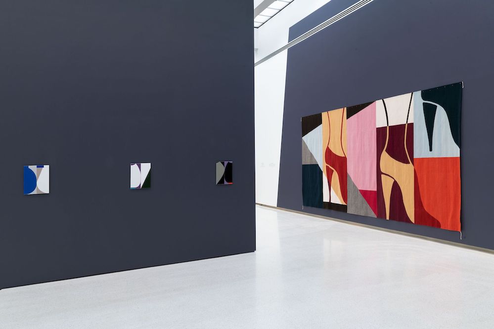 Similarly, the exhibition immediately confronts and challenges the viewer with a collaboration between Ulrike Müller and Sarah Crowner, each taking the side of a large freestanding wall set directly in front of the glass entrance doors. This arresting central placement demands audience attention; in fact, it blocks other work. It argues, like El Anatsui’s commission, that joy evolves from the spectacle of form, scale, and encompassment. The only sightline if offers to subsequent works is a rectangular, door-shaped hole that Müller has cut through the black-painted surface of the wall’s entrance side. On the reverse, the rectangle interrupts Crowner’s wall-covering painting, Sliced Tropics (2018), a collage of curved geometric-but-organic canvas swaths that recall tropical plant leaves. Crowner is a skilled painter, and the painting is splendidly lush without tipping to excess; still, the choice of making a formalist piece so prominent pegs an exhibition about the museum experience as critically neutral.