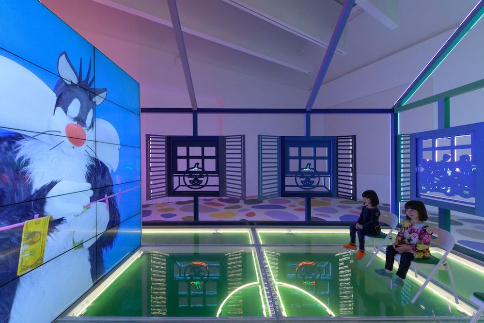 The final punctuation of the central exhibition corridor reinforces this awe of spectacle. Alex Da Corte’s kitschy glass-and-neon house installation may entertain, but it rings empty: with its glowing cupids and jack-o-lanterns, Rubber Pencil Devil (2018) offers colorful, child-like joy, ideal for the requisite family Instagram pit stop. However, visitors seeking greater depth than Disneyesque animation will likely find the jubilation quickly turn to frustration. Da Corte’s house functions as little more than a nostalgic theater for 57 videos of cartoon characters, ranging from Peter Pan to Bugs Bunny, which he interposes with a Mister Rogers narrative leitmotif.