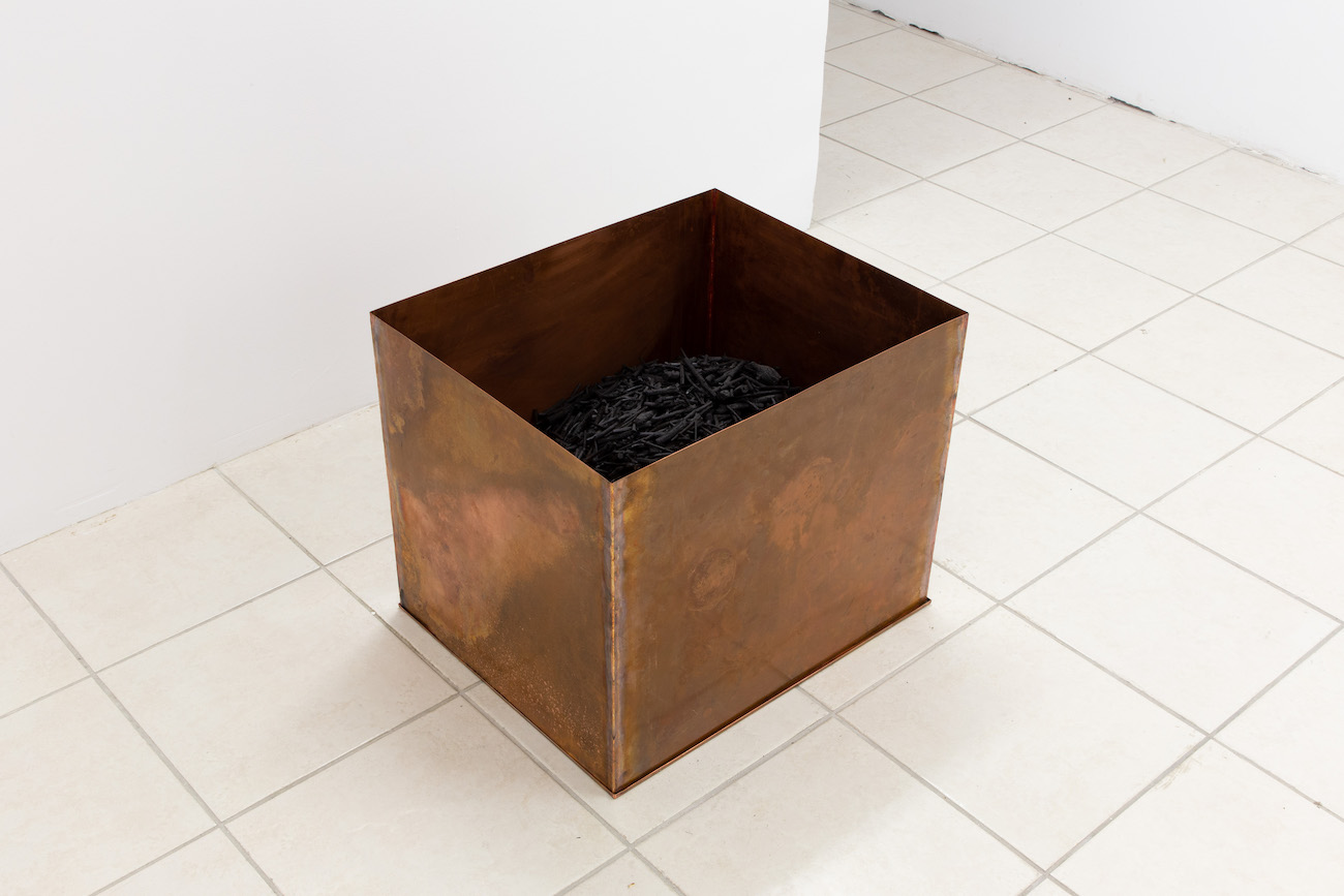 In goodtime, my pile of charcoal (The Witch_1942, 2019–22) moved restlessly around the gallery in an open copper box, each day repositioned in a different location following cryptic instructions I sent to the Plumb members over text: “Put The Witch on top of something. Put The Witch behind the corner. Put The Witch over there. Put The Witch in the wall.”