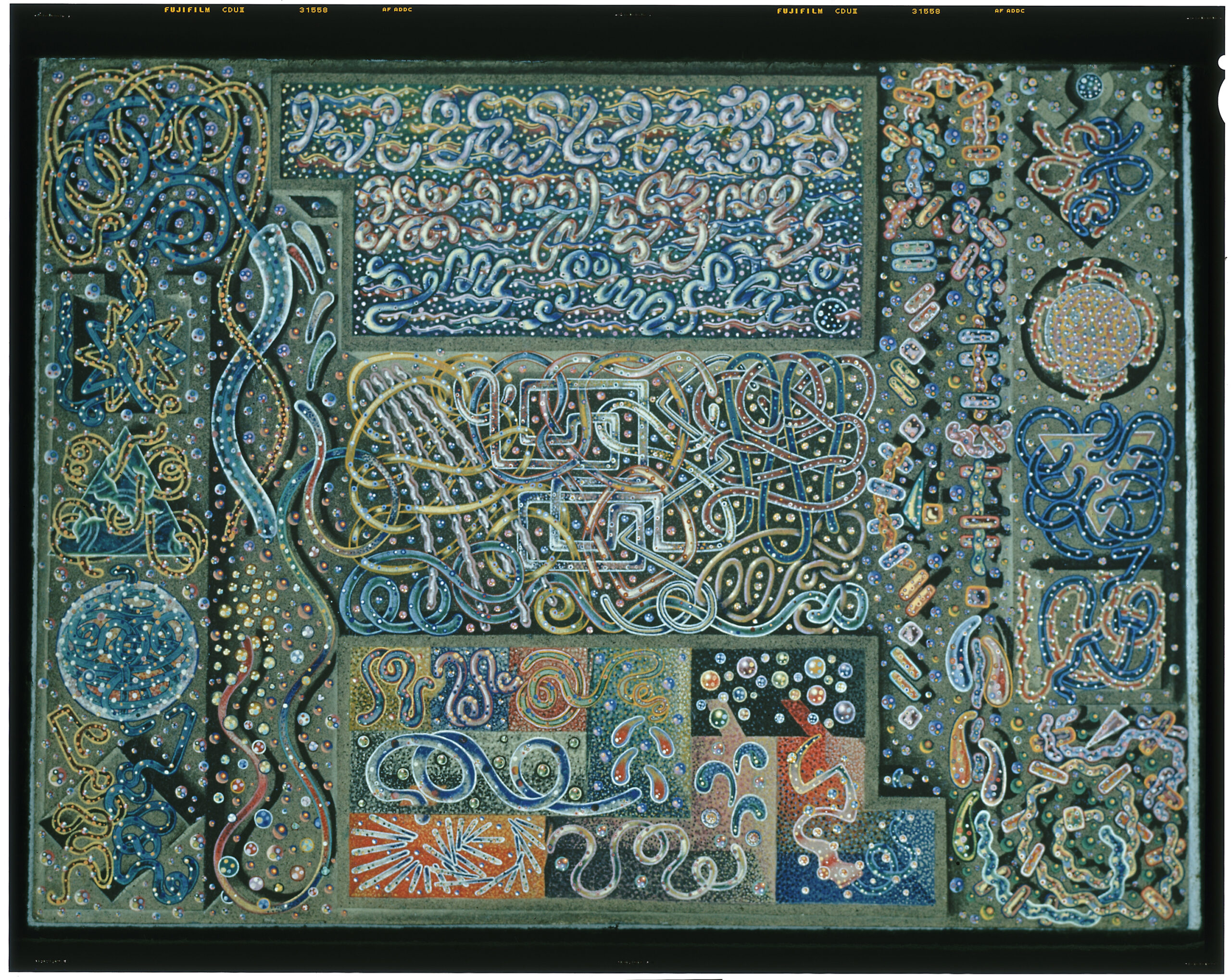 Harry Smith, Manteca [Jazz Painting], c. 1948–49. Lightbox projection from 35mm slide of lost original painting. Estate of Jordan Belson.