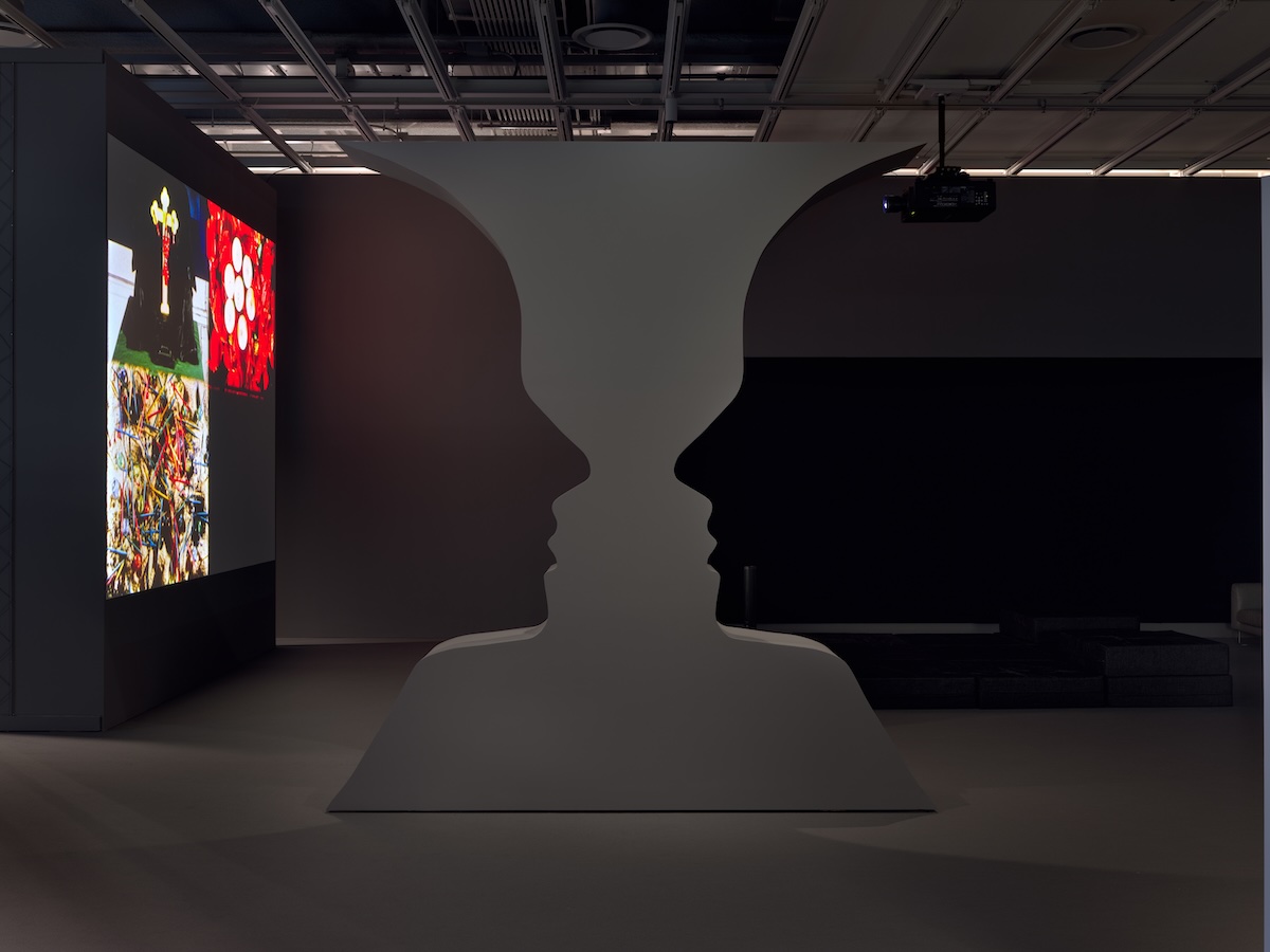At the start of the exhibition, behind the monitor playing Andy Warhol’s screen test of Smith, there is a colossal gray contraption stuck to the wall. I ask a security guard, who turned out to be a huge Harry Smith fan, what it was. He explains that Smith always wanted to project his 1980 Mahagonny film series onto a boxing ring, and that this was a boxing ring mounted onto a wall. There was no film projected onto it, so Harry Smith’s wish still had not been granted. When I ask why it was gray, he tells me that Carol Bove, who helped organize the show, made big gray props for the exhibit. He points to a giant gray Rubin’s vase in the next room that Bove made, but he couldn’t say why it was there. The entire exhibition space is coated in drab gray paint that matches Bove’s sculptural contributions, making the galleries look like an eerie Nickelodeon TV set with all the color sucked out of it. The gray doesn’t disappear; it takes up room with its dull, sludgy hue. It’s somehow vivid in its mutedness.
