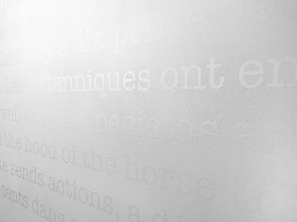 Rather than the usual pot lights, the ceiling is ringed with extra-bright florescent bulbs. Under this blaze of cold light, it’s difficult at first to make out anything on the walls; the space feels stripped and scrubbed, like some heavenly interrogation room. As you enter this atmosphere of pressure-washer minimalism, Mehra’s texts slowly come into focus, like ghosts emerging from a fog. The white vinyl lettering unfurls across the bleached white walls and only really becomes legible in the reflected glare of the lights, so visitors must scrutinize the works by walking back and forth and craning in different directions. Finally, after much squinting and staring, the first sentence materializes: I want a white doctor who doesn’t have brown teeth.