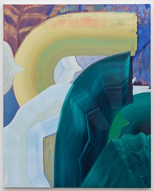 I think of Josef Albers in Moran’s collateral and confident layering of color (Albers compared color theory to constellatory forms, writing “colors appear connected predominantly in space”), and in her design – arching shapes, layered washes that produce hues whose parts you can count – I can see László Moholy-Nagy. There are some of David Hockney’s 1980s pool paintings in Moran’s free approach to wiggling lines and saturated poolside pinks and blues; and Emily Carr in Moran’s textured brushwork, and the forested areas of her backgrounds (which assert themselves aggressively at the front, all the same, like a wall of tropics). These qualities help to underscore Moran’s reference to Lord of the Flies (the lush, equatorial, and crowded vegetation), but also get at something essential in her painting: the way that color, when divided up among the subjects, affects a politics of its own.