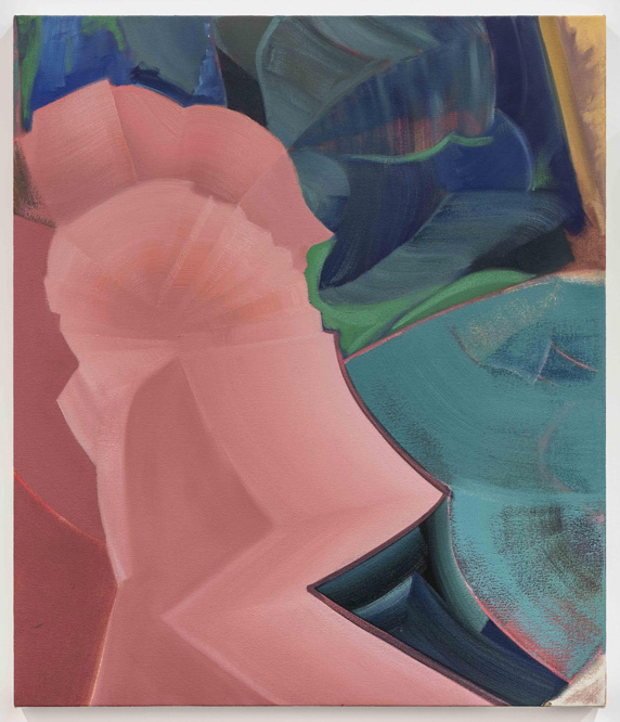 “The space within the space” is where I find Moran doing her most interesting work. In the apogee of this series – the fourfold painting that depicts, in order of left to right, and tallest to shortest, her exhibition’s nominal figures, the boss, the queen, the secretary, and the henchman – we can see narrative cues (a Tudor ruff collar on the queen, a martini on the back of the secretary for the queen to reach for, a scepter in the hands of the henchman). However it’s the interstitial, volumetric, or “background” space, just beyond these figures or their props, where Moran is especially working through the practice of painting with intuition, intelligence, and a deep regard for art history.