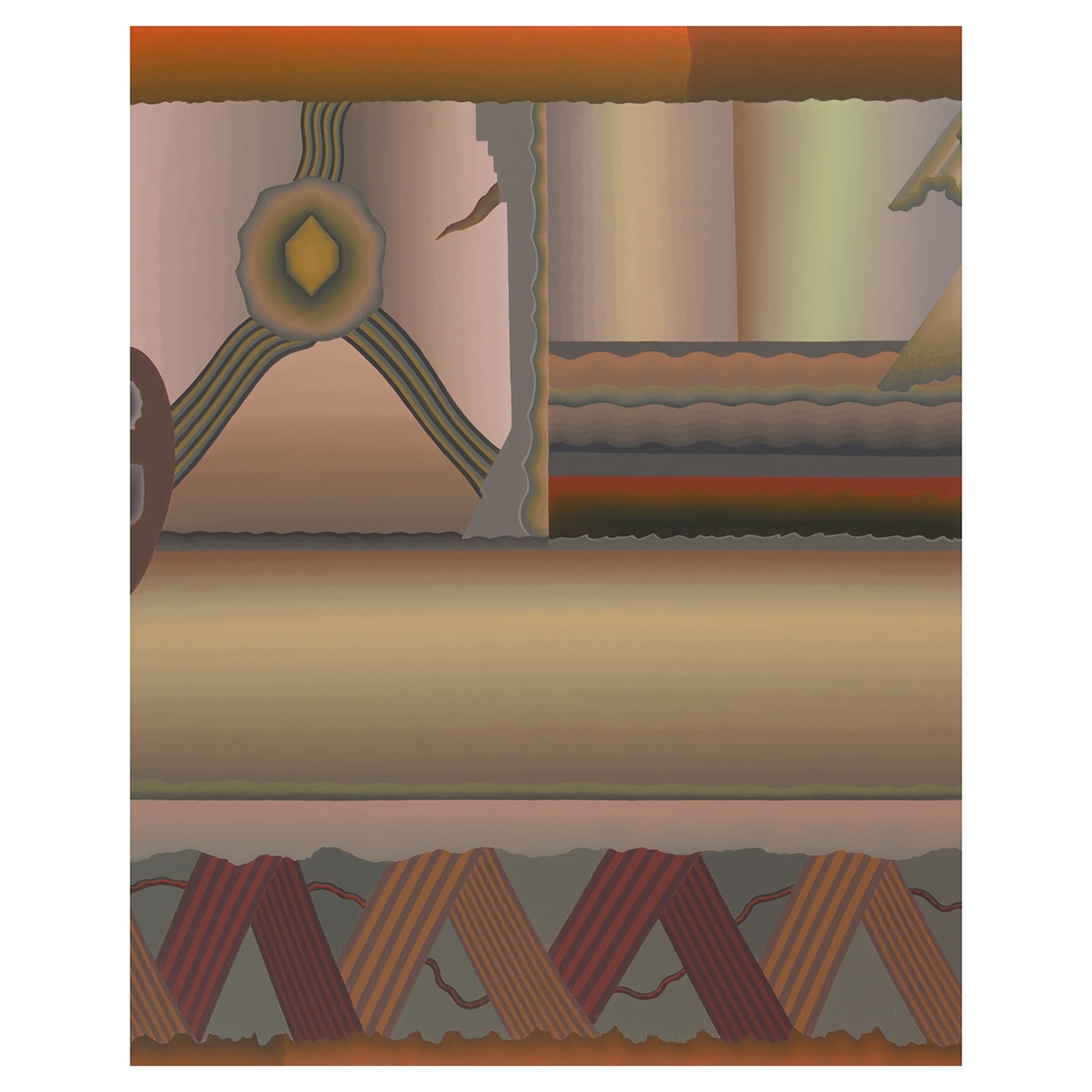 Halkin, the oldest of the four, was born in 1924; Ramberg, the youngest, was born in 1946, just three years before Halkin graduated from the School of the Art Institute. (Statsinger was born in 1927; Rossi in 1940.) Despite their age differences, the four share a kindred visual idiom. The exhibition’s curatorial framing invites us to focus on the artists’ deployment of form, a key element of Imagism that’s often upstaged by the movement’s more obvious perversities. (See, for example, Nutt’s gallery of pimpled and oozing rogues.) But those forms—bulbous and biomorphic shapes for the most part—bury the lede: even in its more abstract iteration, Imagism imparts an ineffable neuroticism. (“Chicago art is the example of a deliberate if risky attempt to make ‘mad art,’” Donald Kuspit has noted.) One need only look at Statsinger’s 1977 painting Sound Raga (Fall) to see this fact in all of its counterintuitive drama. With its luminous gradients and rhythmic stripes, the painting at first recalls the meditative scenes Miyoko Ito produced around the same time—but don’t be lulled. There’s a sense of atmospheric disturbance here that’s only intensified by Statsinger’s palette of overcooked oranges, dusky reds, and humble blues and greens. Serrated edges divide the picture into quadrants, hinting at a kind of orderly violence. A sheared object, as of a shank or snapped wood, juts into the upper right frame. In the upper left, a radiant crystal—or a cell, yolk, or geode—emanates uselessly, like a radio in an empty room. It’s a painting of dissonant moods, at once ethereal and cautionary.