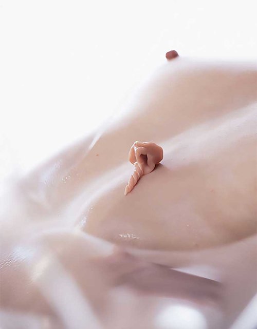 Without any scaffolding explanation, the overriding impression given by the dreamlike images is of a futuristic community engaged in a telepathic intimacy transcending language. The mysterious blob and prosthetic objects suggest a kind of organic technology that has enabled new forms of perception and communication; the way these tokens are cradled and stroked implies an evolved form of the relationship people already have with their smartphones. However, nothing in Favreau’s video explicitly suggests high technology: there are no screens, nothing metal or plastic, nor even furniture or hints of personal possession aside from minimal clothing. The dominant textures of the piece – skin, brick, wood – invoke the past as much as the future. Will Deliquesce conjures a life of cerebral eroticism, in which technology seamlessly integrates with primal human needs.