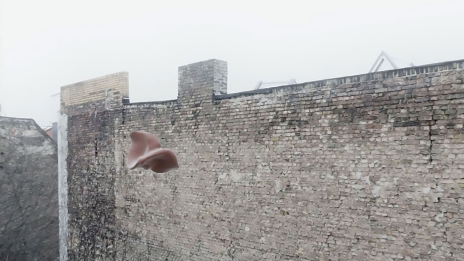 Will Deliquesce was a culmination for Favreau. The exhibition’s titular 8-minute video – which was presented with an installation including sculptures and photos elaborating on its formal motifs – extends the ambient sensuality of Délicat Pulse into a more developed (though still cryptic) narrative setting: a half-dozen nude and semi-nude people (light-skinned, European, of indeterminate gender and age but youthful appearance) congregate in a sunlit apartment, touching each other’s bodies slowly and silently with their hands and a series of small objects. These sculptural prosthetics seem both technological and organic, some spiny, like cartilage, and others round and polished as stones. At one point, the camera pans out the window, where we see a strange, pinkish item hovering – a smooth, alien mass that resembles a disembodied tongue or muscle, like a larger version of the talismans the characters use to caress each other – before it glides noiselessly away, down the brick-walled alley.