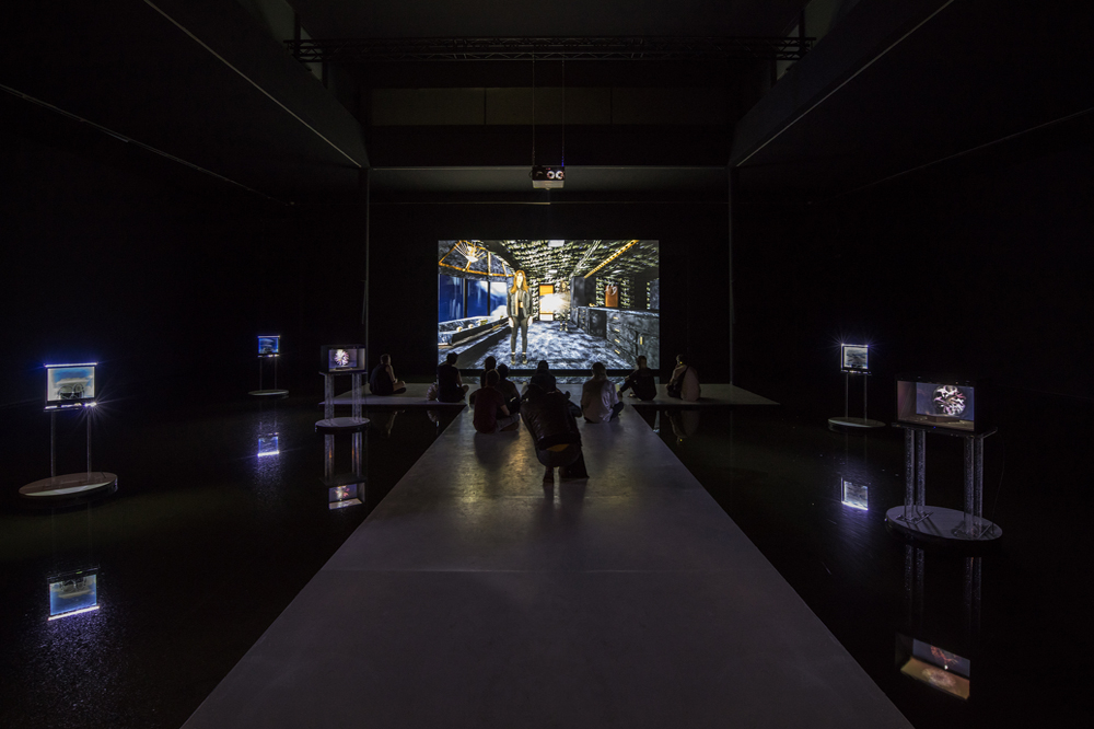 The virtual reality and gaming aesthetic continues, however less convincingly, throughout the dark labyrinth of adjoining rooms at the Kunst-Werke Institute for Contemporary Art (KW) in Mitte. The main room of the venue is given over to Cécile B. Evans’s installation What the Heart Wants (2016), a big screen at the end of a floating catwalk, its projections reflected in the surrounding water. Part of the video is a 3D animation of a post-apocalyptic, sci-fi scene that references tendencies familiar to the present: reflections on the nationalistic dimension of tragedy, as certain people are invited to tag themselves as “safe,” and the reign of a benign activist group seeking converts under the banner of the “Anti-Aging” flag. Later, images of pristine mountain landscapes are overlaid with vacuous text messages: “people had feelings and stuff.” The roving iMessage chat is a common theme in the biennial, popping up on screens with its familiar ping, a kind of contemporary audio-visual poetics.