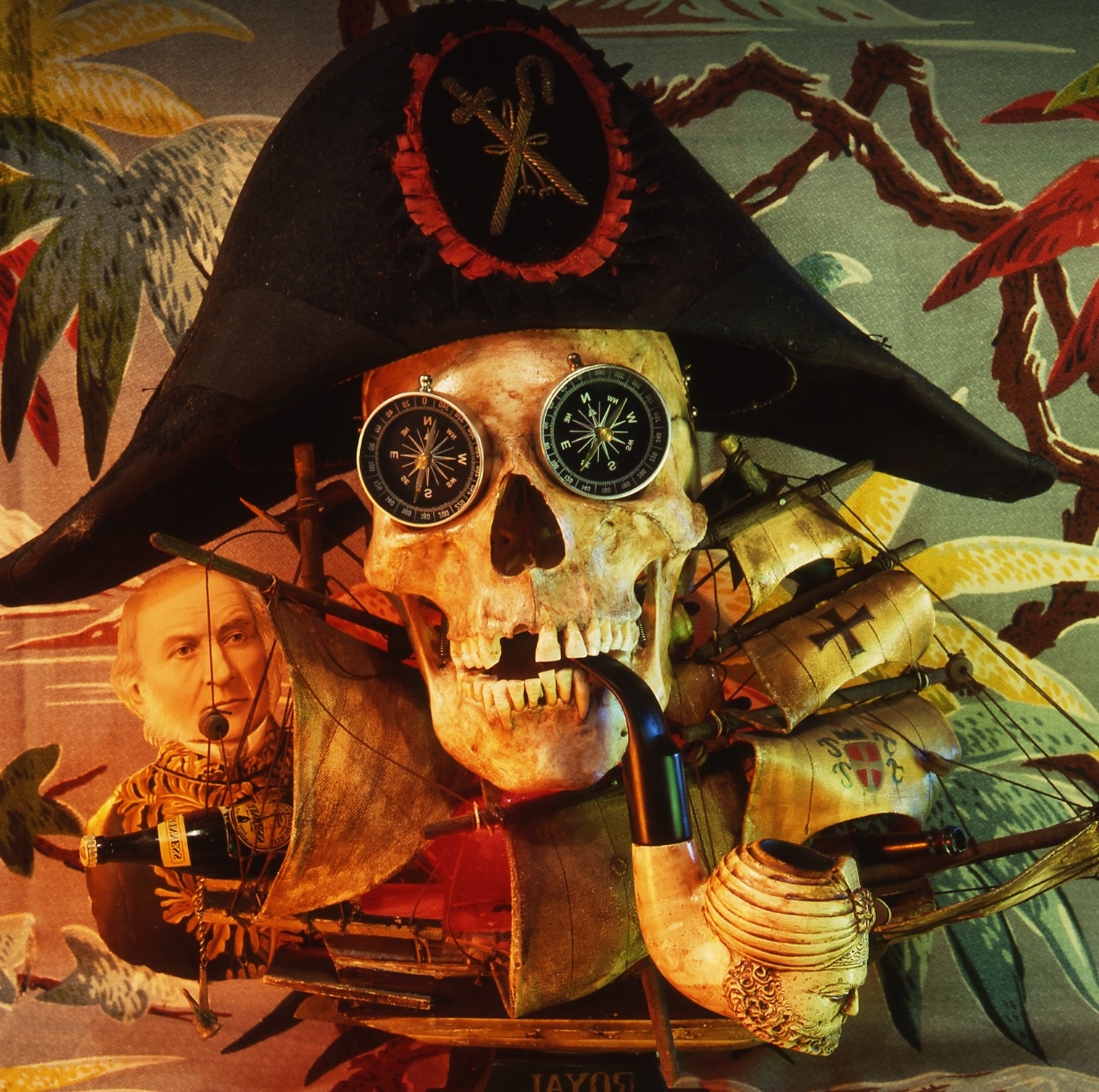 Initial inspiration for Presidential Cabinet—a project he undertook from October 1985 to February 1986—came from Spectacular Helmets of Japan, 16th–19th Century, an exhibition he saw at the Japan House Gallery in New York City. Tress imagined using similarly elaborate and flamboyant headpieces to portray the secretaries. Soon he landed on the idea of placing his own fantastical hats on skulls, thus activating deeper art-historical references: the medieval allegorical genre of the “dance of death,” the vanitas still lives from the Dutch Republic, and José Guadalupe Posada’s late nineteenth-century Day of the Dead prints, a highly political body of work Tress had collected while living in Mexico two decades earlier. Well into the 1980s, human bones were easy to come by, at least in New York City, since medical-education companies imported tens of thousands from India each year, working with networks of grave robbers and preying on vulnerable families. Calcutta reportedly exported about sixty thousand skulls and skeletons in 1984. Tress purchased four such skulls at fifty dollars apiece in the medical-education section of the flagship Barnes and Nobles in the Flatiron District. At the time, he did not fixate on the ethical quandaries, though knowing that rampant global exploitation enabled the project now lends another alarming layer to his images.