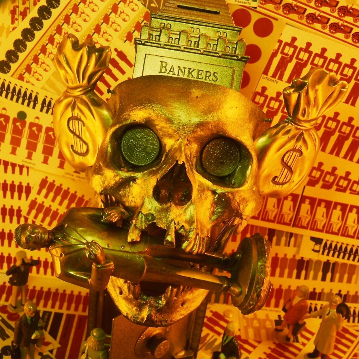 Over the course of a few months, Tress used these leering skulls, sometimes painted and repainted, to create and then photograph about a dozen miniature installations containing a ghastly assortment of objects and images sourced from flea markets, junk shops, and derelict buildings, and illuminated by electric lights covered in colored cellophane. Each picture offers an allegory of a presidential secretary, though the first one represented the president himself, like Mr. Monopoly in a top hat, chomping on a cigar. The Secretary of the Treasury shows a golden skull—ear canals covered up with moneybags and eye sockets enclosing coins—gobbling up a worker as other individuals, depicted with found German railroad toys and illustrations cut from Russian Cold War propaganda, scurry about in the background. The Secretary of Education, meanwhile, features a green skull atop a Japanese “Answer Game” robot patrolling three children, trapped inside computer monitors. This was a reference to the overemphasis on standardized testing and the counterintuitive financial penalization of schools that did not meet federal requirements. Another work, The Secretary of the Interior, shows a skull with a beaded gas mask, glass eyes normally used for taxidermized animals, colorful feathers evocative of a clown’s wig, and the Old Crow bourbon mascot as a hat; the skull perches on an oil rig in a landscape that has a tepee. With this picture, Tress specifically sought to target James G. Watt, the aggressive, racist appointee from Reagan’s first term who promoted oil and gas drilling on federal lands, neglected the Bureau of Indian Affairs, and openly criticized tribal reservations as the “failure of socialism.”