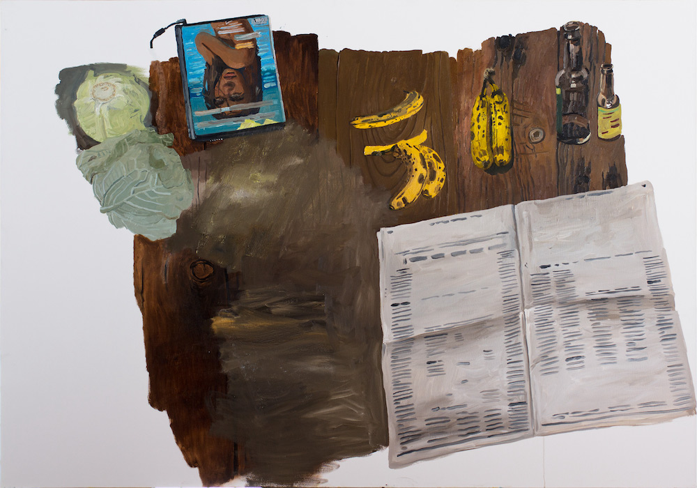 According to Williamson’s deadpan narrative, she started playing with space in this way back in 2008, after realizing that “paintings are flat.” In 2015, when she returned to At night I painted in the kitchen, she discovered a minor-seeming innovation that propelled her toward a follow-on revelation: among the objects arrayed haphazardly across the tabletop – a DVD, an open newspaper, a cabbage – she had included the same two bananas twice, one pair darker than the other because they were painted a few days later. This was a small detail, but nonetheless it reminded her that “paintings don’t move,” and led her down a path she has followed for the past five years.