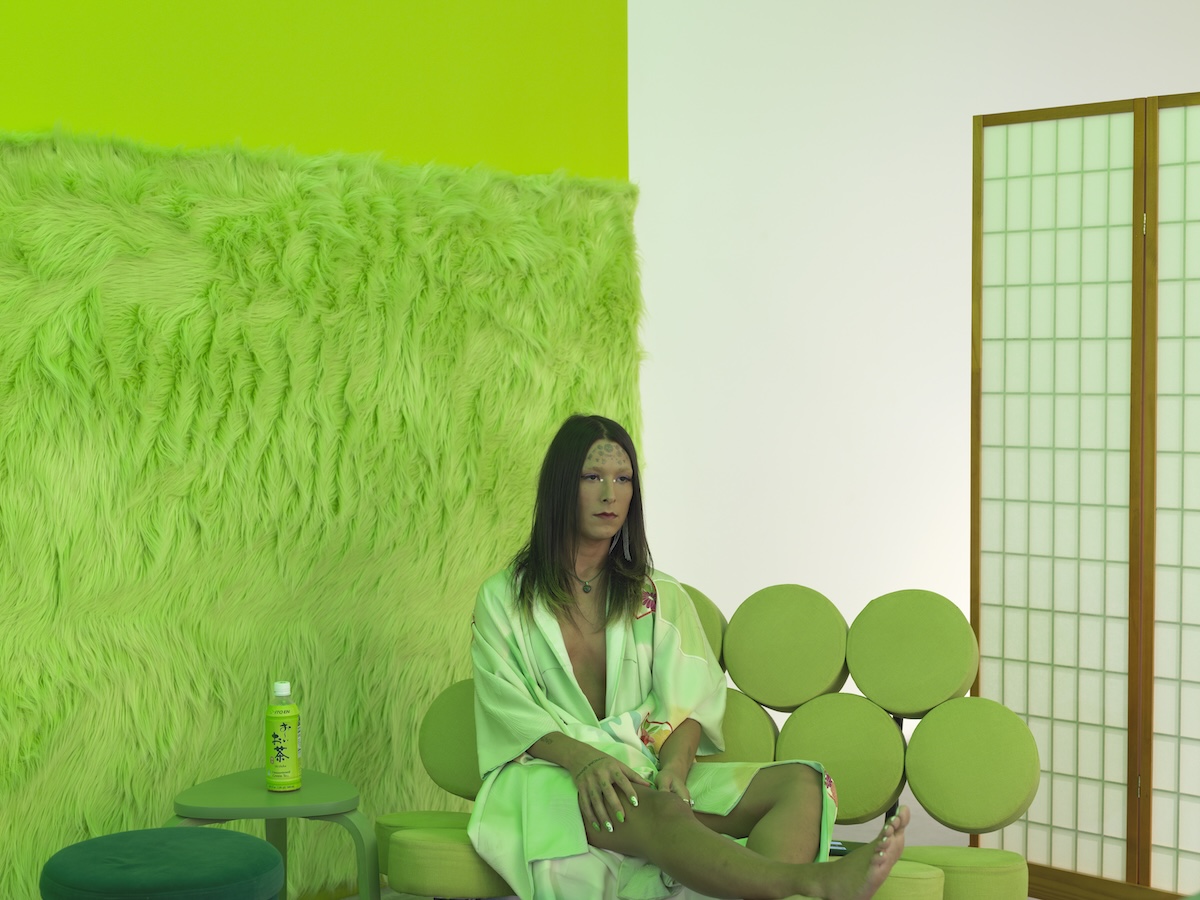 Curated by Vivian Crockett with support from curatorial assistant Ian Wallace, Puppies Puppies’s exhibition divides the lobby gallery into three parts with shoji screens. The first section is a Zen garden inspired by the one at Ryōan-ji Temple in Kyoto and is a testament to the artist’s Japanese ancestry. Another features MRI scans and cannabis plants, tools that, respectively, documented the brain tumor the artist had removed in 2010 and aided in her recovery. The centerpiece of Nothing New is a recreation of Puppies Puppies’s green bedroom, complete with a full clothing rack and glowing paper lanterns. Together, the three vignettes offer an intimate and revealing look into the life of an artist who has previously hid behind proxies, costumes, and avatars in both performances and interviews alike.