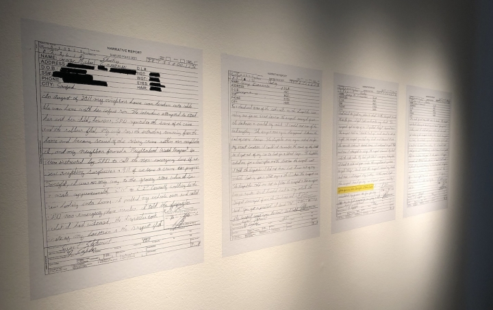 There is a room for reflection with plush fuchsia carpeting outside of American Monument, an exhibition by lauren woods (she always uses lower-case letters) at the University Art Museum (UAM) at Cal State Long Beach. woods designed it, placing deliberately empty vitrines against each wall, because, had her exhibition unfolded as planned, visitors may have needed a chance to breathe and think after listening to audio recordings of police officers and neighborhood watchmen berating black victims, or paging through police interviews and reports revealing the extent of systemic, racist violence in this country. But, since woods’s exhibition opened without either the audio files or documents on view, the room with the plush carpet feels ominous, its emptiness underscoring the silence and absence that now characterize the show.