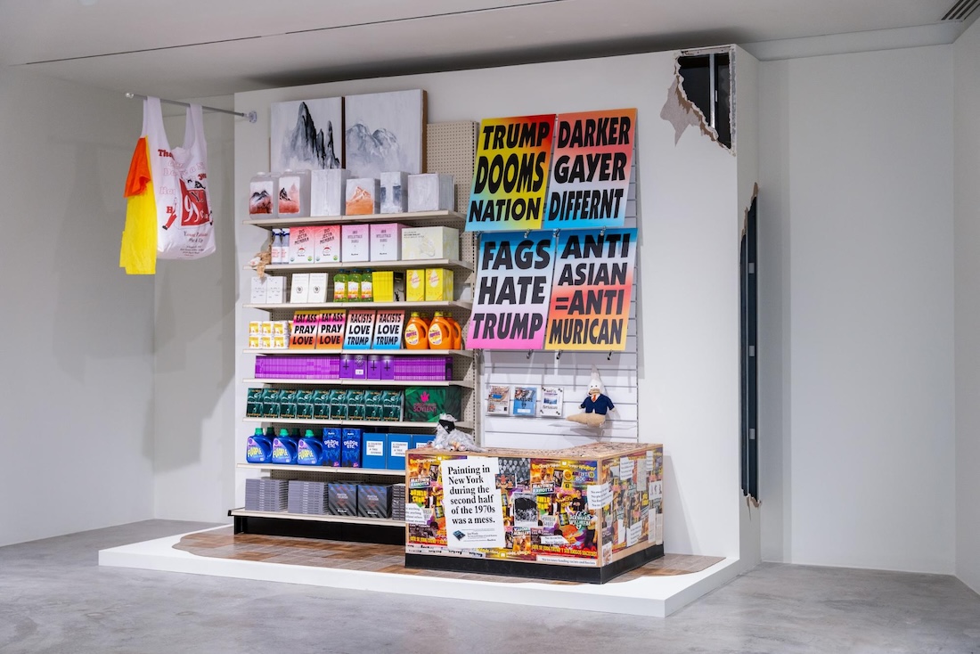 In Breathers, the installations most illustrative of Chan’s history of concrete political engagement are in the exhibition’s retrospective section on his experimental publishing project Badlands Unlimited, and outside, where the large-scale projection Paul’ V.4.3 (2021–ongoing), which premiered at CAM St. Louis, loops. Founded in 2010, Badlands was born out of Chan’s effort to step away from visual—specifically video—art, and offers in the show the earliest examples of the artist’s political position. For instance, in 2012, more than a decade after US forces invaded Afghanistan and then Iraq, Badlands published a book of Saddam Hussein’s speeches on democracy; the book is included in a facsimile of Badlands’ New York storefront, which was open from 2016 to 2019. Chan’s decision to compile these speeches (in English, for the first time) was motivated by his 2003 visit to Baghdad as a member of the Iraq Peace Team. On Democracy by Saddam Hussein became an interrogation of what democracy could and should be, because it asks American readers to question what their country was truly doing in Iraq. Badlands, in both its physical location and online home, became a way for Chan to challenge how and where we receive information.