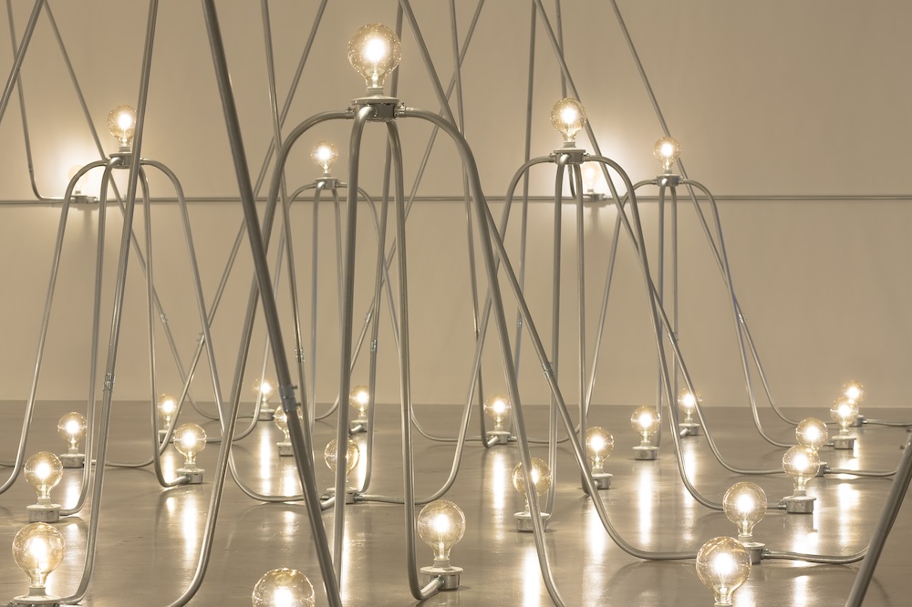 Among the earliest of these works is Electrical System (1982), comprising a room-spanning web of steel conduits, electrical fixtures, and light bulbs. Its pipes course across the room in undulating waves that crest nine feet above the floor and are regularly punctuated by Edison bulbs, illuminating the otherwise unlit gallery and underscoring the work’s utility. Along with Heating System (1984–85) and Electrical Lighting for Reading Room (1985), Electrical System is currently on view as part of Holt’s solo exhibition at the Wexner Center for the Arts in Columbus, Ohio. Shepherding the viewer through infrastructure that is usually hidden, the latter two works can be tweaked by visitors via (respectively) a twistable valve and on-off pull chains, inviting us to feel at home in the galleries.