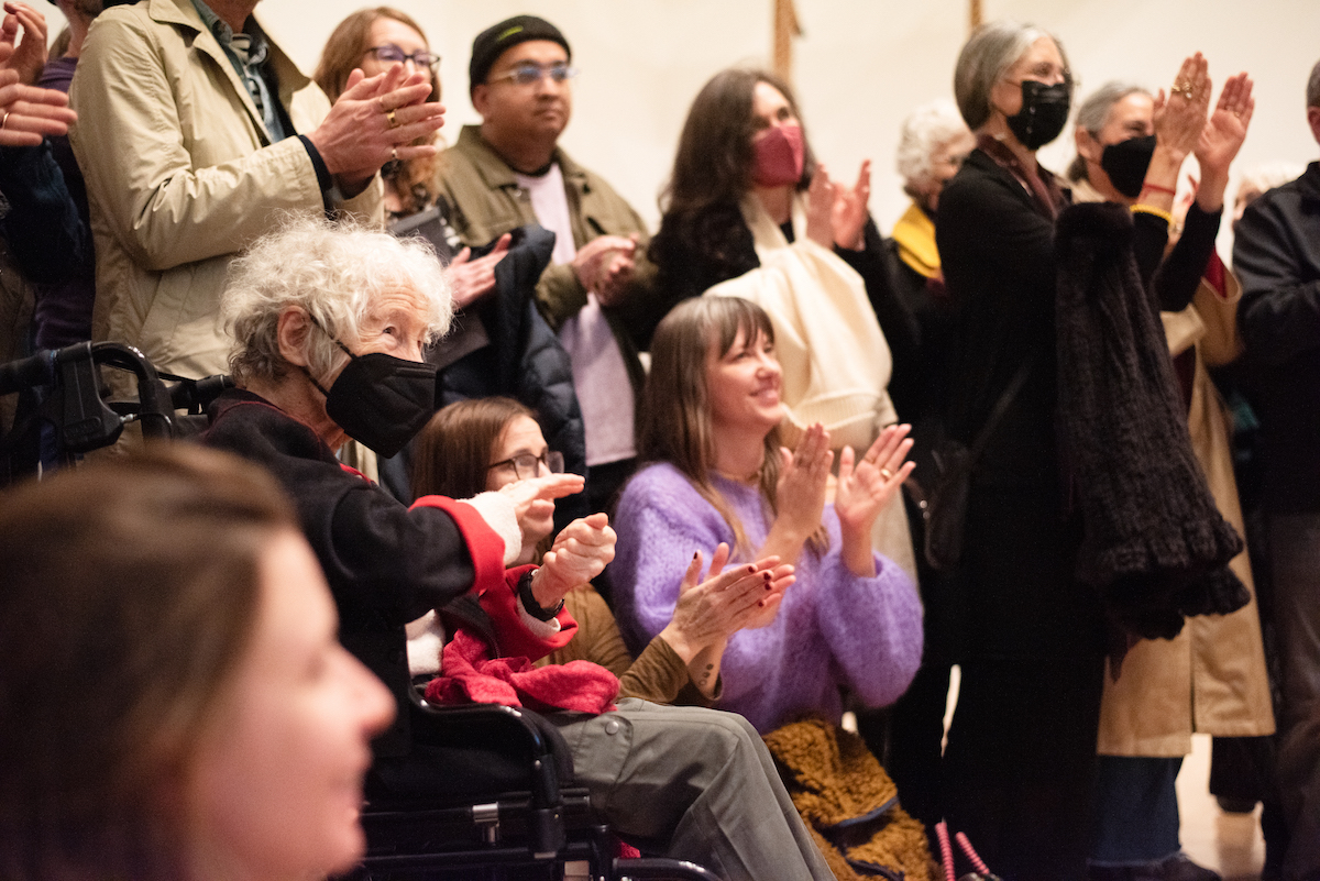 Simone Forti applauds the performers of the “Dance Constructions” during the opening of “Simone Forti” at MOCA, January 14, 2023. Photo: Roxie Fuller.