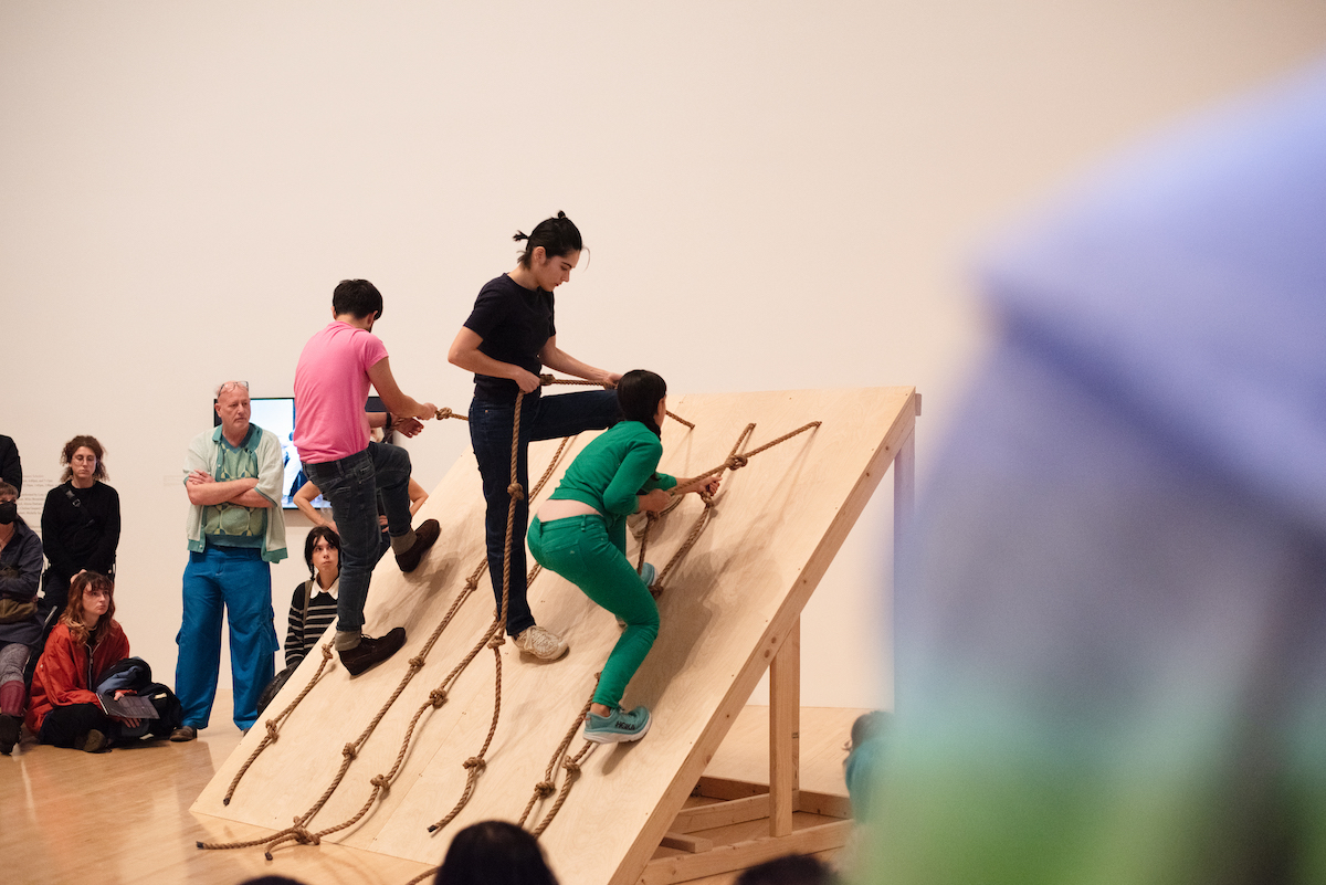 Simone Forti’s “Slant Board,” one of the “Dance Constructions” performed during the opening of “Simone Forti” at MOCA, January 14, 2023. Photo: Roxie Fuller.