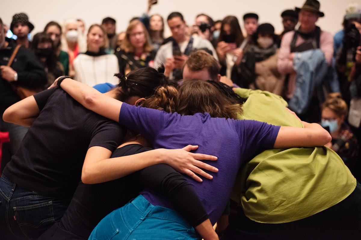 “Huddle,” one of Simone Forti’s “Dance Constructions,” performed during the members opening of “Simone Forti” at MOCA, January 14, 2023. Photo: Roxie Fuller.