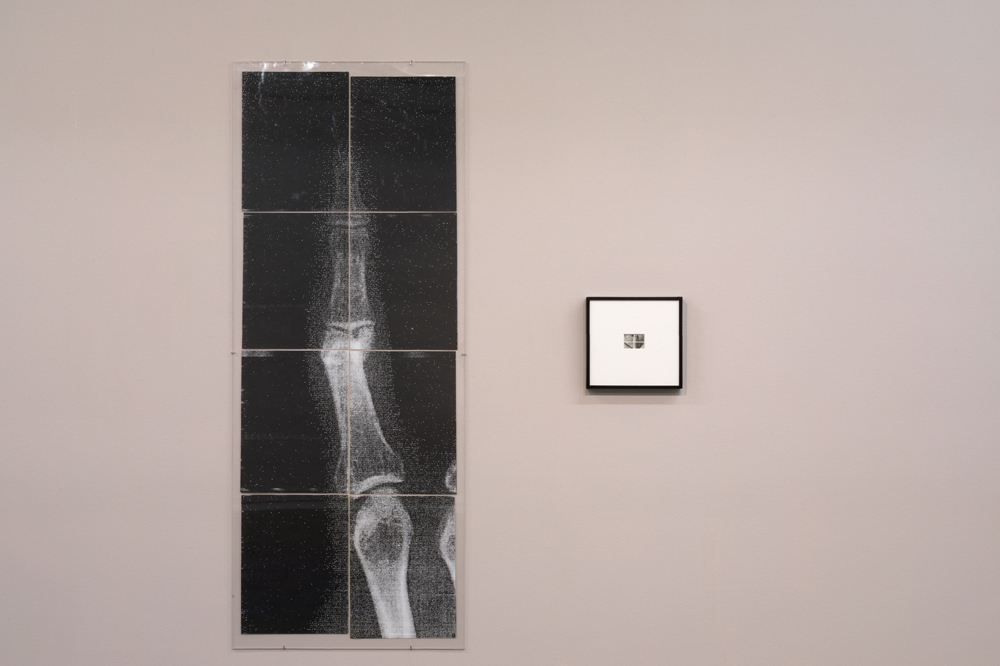 I may be going against the grain but I think it possible to pry open this closed relationship. But it is possible only if we think of the resultant image in its materiality as the outcome of a process. The high-contrast bleaching and the dark drift of graphite over the image’s surface, captured by the folds and crevices of its referent body, was much like the beat of a relentless sun on the sidewalks of the city, with their accreting seepage of decay. The resulting image of self, the merging narcissistic duo, was not being exalted as an ideal; it was being degraded. Yet Hudinilson Jr. could say, “There is something erotic about kissing the walls of São Paulo, the passion I feel for this city…” Think of these photocopies of himself rather as substitute frottage of the streets he loved. Yet his passage there was contradictory. His fellow pixadores, those proponents of graffiti (pixação) unique to the city, do not think of their runic tags as narcissistic reflections of themselves but rather as a degradation of the city. We can look at Hudinilson Jr.’s X-rays of his fractured limbs (sustained in those same violent streets) – and a corrosive technology he exhibited on par with his Xeroxes – in the same light: the decomposing body of Narcissus rendered apart like the bony and brittle severity of pixação.