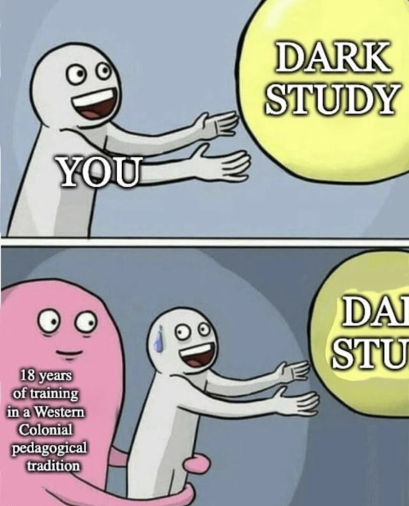 CC: Universities invest a lot of money to be a destination. Dark Study diverges from that by being virtual. We have an advisor who lives and works in Europe; I want us to be a global school. Institutions try to set up to play by setting up campuses abroad as a colonial pursuit, but it’s weighed down by layers of regulation. All of the IRL “wining and dining” required to work with someone and to move someone from this place to that place comfortably, to court them as faculty or as students … being a virtual school flattens or eliminates these logistical concerns.