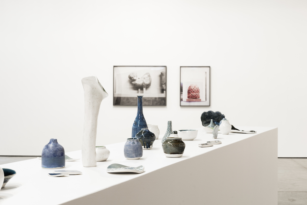 It’s also, more pragmatically, geared towards art’s particular economy. As Claire Bishop once wrote about Tacita Dean, another artist noted for her “archival aesthetic” and fidelity to old media, “The sumptuous texture of indexical media is unquestionably seductive, but its desirability also arises from the impression that it is scarce, rare, precious.” In this regard, it is clearly smart, strategically, for Sidarous to direct her attention to more “museum-quality” objects. A similar impulse also extended to this exhibition’s presentation strategies. Aside from the muted tones and prevalence of black-and-white in this suite of photographs, the hanging was more uniform and restrained than anything Sidarous has mounted to date: all the photographs were identically framed and ran in a continuous line around the walls of the gallery, which was crossed by a long, white plinth bearing dozens of Sidarous’s small ceramic vessels and sculptures, all in cool, marine shades of green, blue, grey, and white that corresponded to the photos.