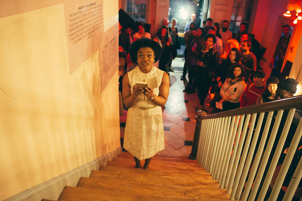 Only When It’s Dark Enough Can You See the Stars implores viewers to speak out against such inequities. With the addition of a bullhorn and a ladder, the Peale’s garden has been transformed into the Airing of Grievances. If a person is so inclined, they can climb a few feet up and shout at the bureaucrats in Baltimore’s city hall, only a few blocks away. On the second floor, in The People’s Theater, an open mic always remains turned on under the starry sky of a battered black tarp, waiting there for those who wish to declare, to voice dissent. Viewers are encouraged to become dialogists not only with the exhibition, but with history and the city of Baltimore.