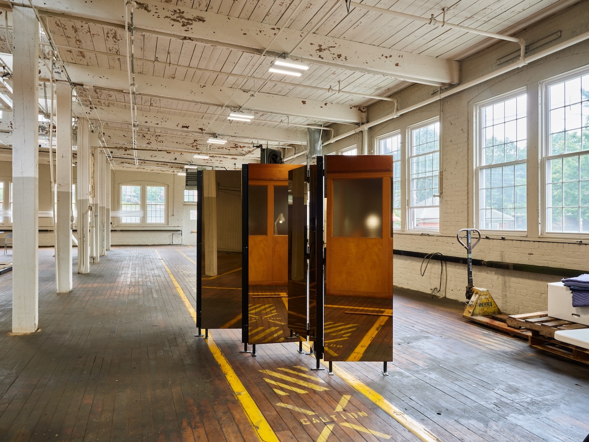 I was intrigued to see what effect this singular site might have on works so responsive to local histories. Various iterations of Burr’s dark mirrored screens have filled galleries, ornate halls, and gardens before, the artist adapting dimensions and scales each time. Across one space in the factory, a folding screen featured alternating dark mirrored panes and opaque panels. A 2011 iteration of this work, entitled A Few Golden Moments, was aligned with painted guidelines from the Torrington factory’s former industrial days, in a way that was unexpectedly pleasurable to my senses, evoking high school basketball courts or ceremonial sigils drawn on wooden floors in ritual. The steel and aluminum screen casually electrified the otherwise humdrum worn and scuffed smooth surfaces of the works. This object performed remarkably similarly as it does in other climes: like an orgone beacon, a libidinal lighthouse.