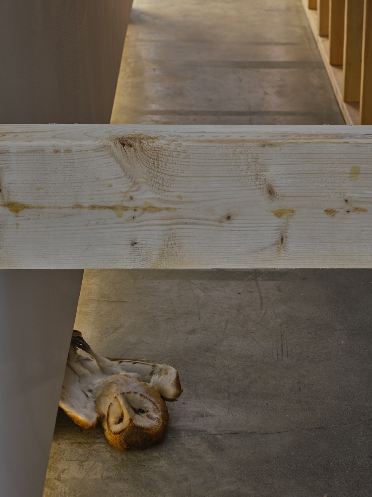 In the Belkin show, after encountering the arrangement of Monstera deliciosa and the frozen fountain, you turn a corner to find an oversize, tilting cake with flickering candles that faces a two-way mirror reflecting the room. Around the next corner, a dead fox lies in wait; opposite it, a dead owl is tucked beneath the wall. The animals are taxidermy—“ethically sourced” by a vegan taxidermist, as the artist notes—creatures that were not hunted but met their ends by accidental or natural causes. If the plants and fountains articulate one register of Akhavan’s artificial ecology through the technological sustainment of life, the taxidermy animals articulate its opposite: the preservation of death under the semblance of vitality. Together they compose a system in which time moves unevenly, its shifting tempo set not by nature but by artifice.