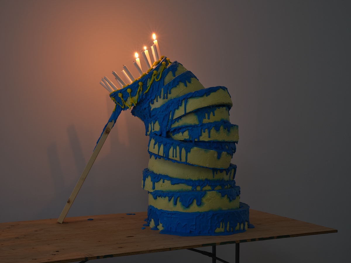 Reentering the room with the mirror and cake, you cross the reflective surface once more, catching your own image as you look toward the cake. At this point, confronted with the artifice of blue icing, flickering candles, and precarious stacks of foam, you might pause with a question in mind—not the usual, “But is it art?” but the more ludic: “But is it cake?”