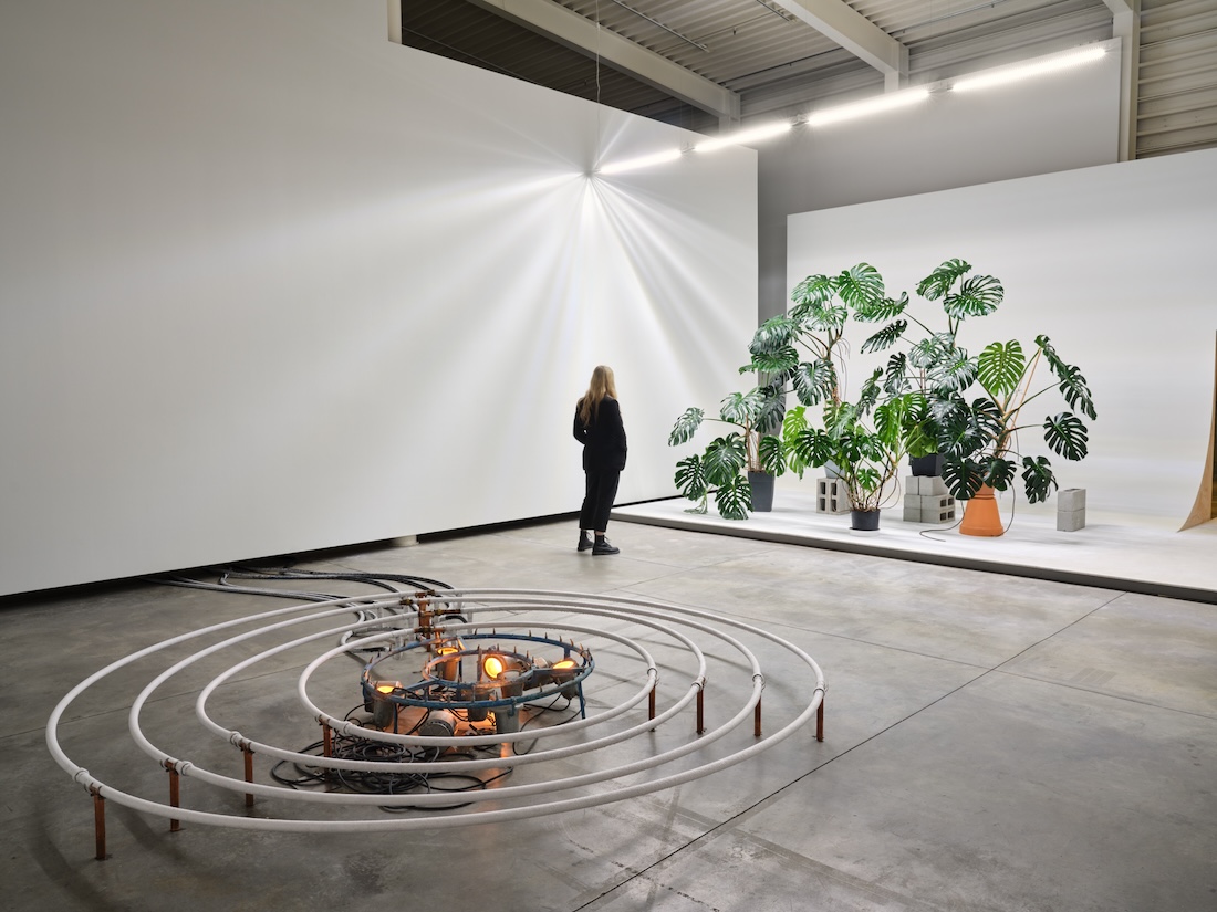 This concealed machinery is central to Akhavan’s artificial ecology: Life and temperature are regulated behind the scenes, forming a single circulatory system. What appears organic is sustained only through a web of hidden infrastructures that keep the whole tableau alive and humming. This modulation of time, not by natural cycles but by regulated systems, sets the stage for a show in which artifice itself becomes a temporal medium. The arrangement of potted plants deliberately recalls a photograph of Matisse’s late studio, though it is not altogether clear why Matisse is referenced here. The plants are overgrown and towering, arranged in a line against the wall. True to their name, they are monstrous—much larger than a person, their leaves spreading far beyond any domestic scale, looming overhead like a many-headed hydra. One moves around them, confronts them, perhaps photographs them, and participates in the choreography, much as one moves through a greenhouse picking out plants to take home.