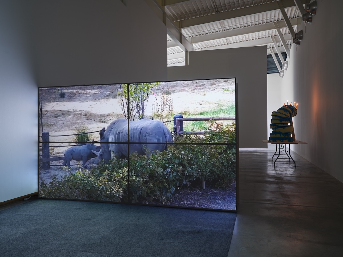 The entire exhibition forces this durational encounter: Time passes as you pass over it, around it, and within it. The plants grow, the cake tilts, the candles flicker, the surveillance footage loops, the fountain recycles its water, flowing, looping, flowing. The dead animals look lively but remain dead. This circulation of water, footage, heat, and decay extends the logic of Akhavan’s artificial ecology. Even the frozen fountain refuses stillness: The pipes thaw, the ice gradually melts, and the Belkin staff mop up the pool of water the next day. Time could be measured by the interval separating the moment you step onto the stage and the moment you walk off it.